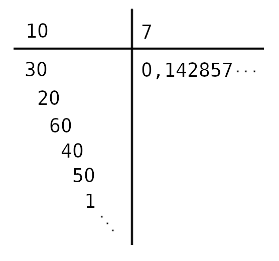 La séquence 142857 se répète indéfiniment et, pour cette raison, le développement est qualifié de périodique. Autre exemple :